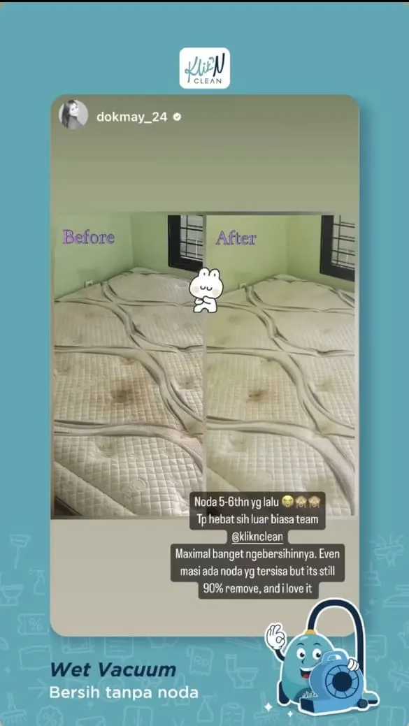 | Pembersihan 1 sisi / 2 sisi untuk kasur berukuran Single (90 x 200 cm atau 120 x 200 cm), Queen (140 x 200 cm atau 160 x 200 cm), King (180 x 200 cm), Super King (200 x 200 cm). |